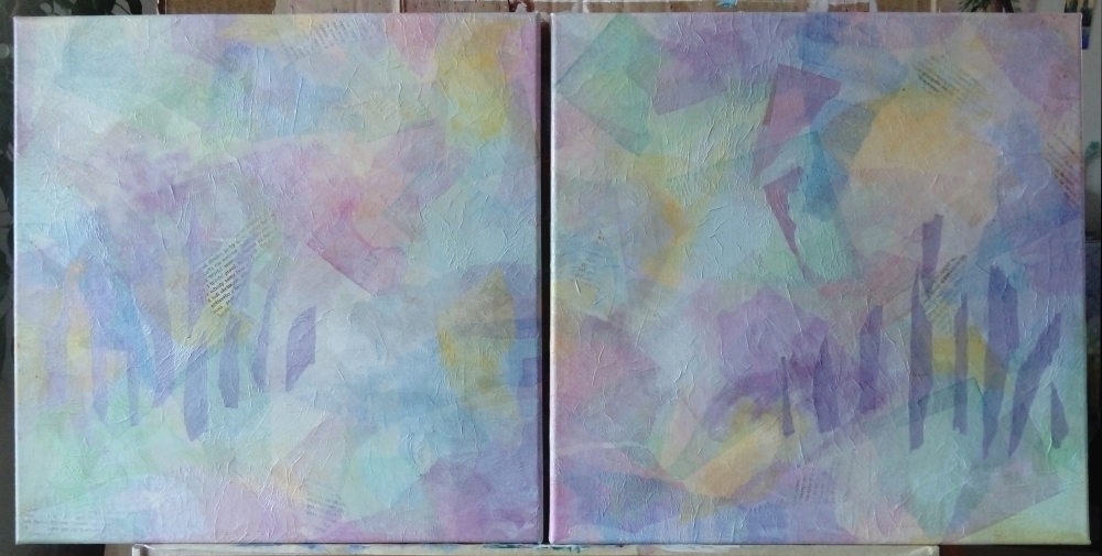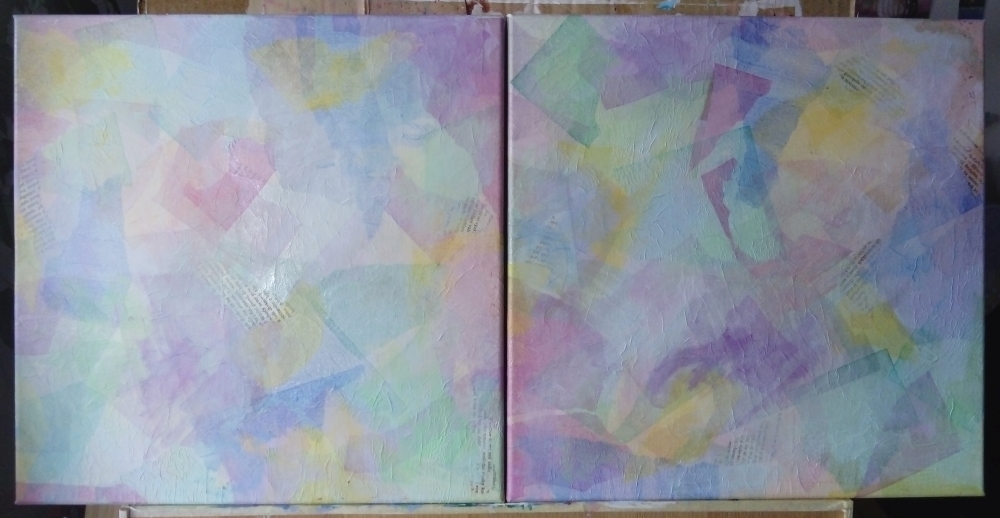 2. začínám přidávat koláž z barveného polo-průhledného papíru a kombinuji s malbou,